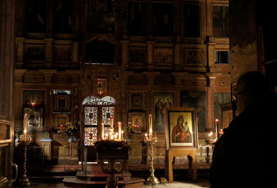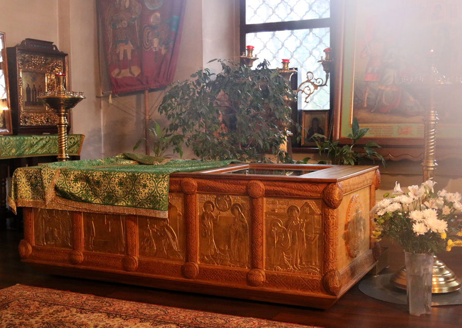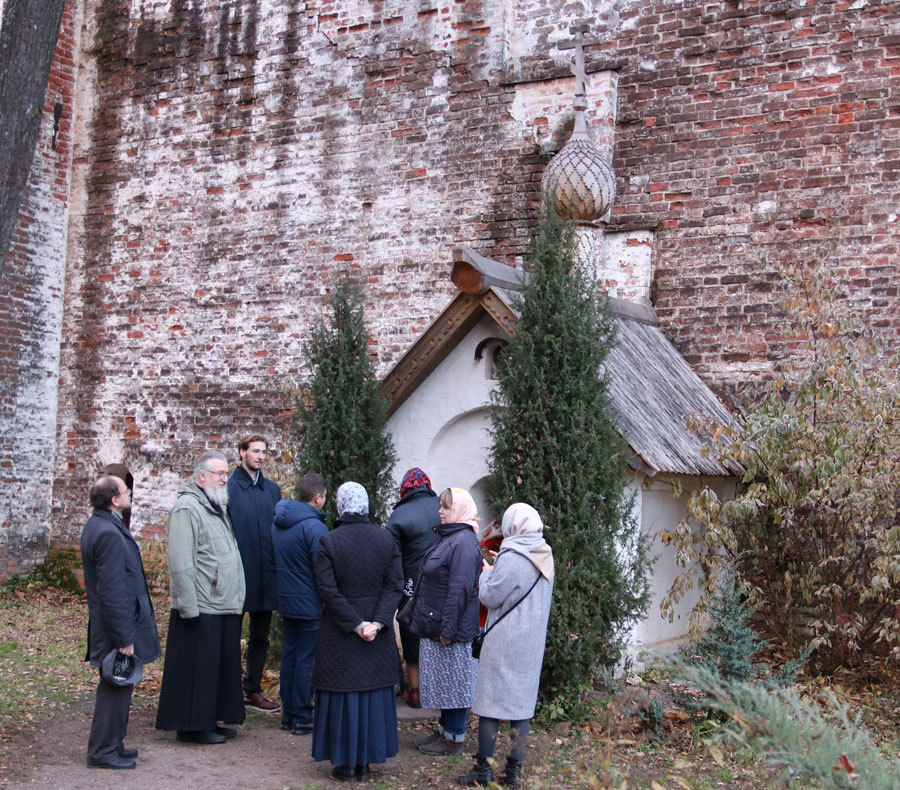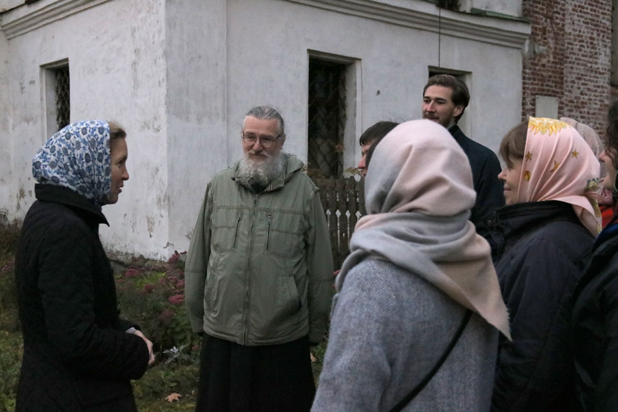 Вечером паломники помолились на монастырской всенощной московским святителям в древнем соборе святых страстотерпцев Бориса и Глеба, где ведется реставрация настенной живописи. Монастырская служба свершалась неспешным знаменным пением и уставным чтением.