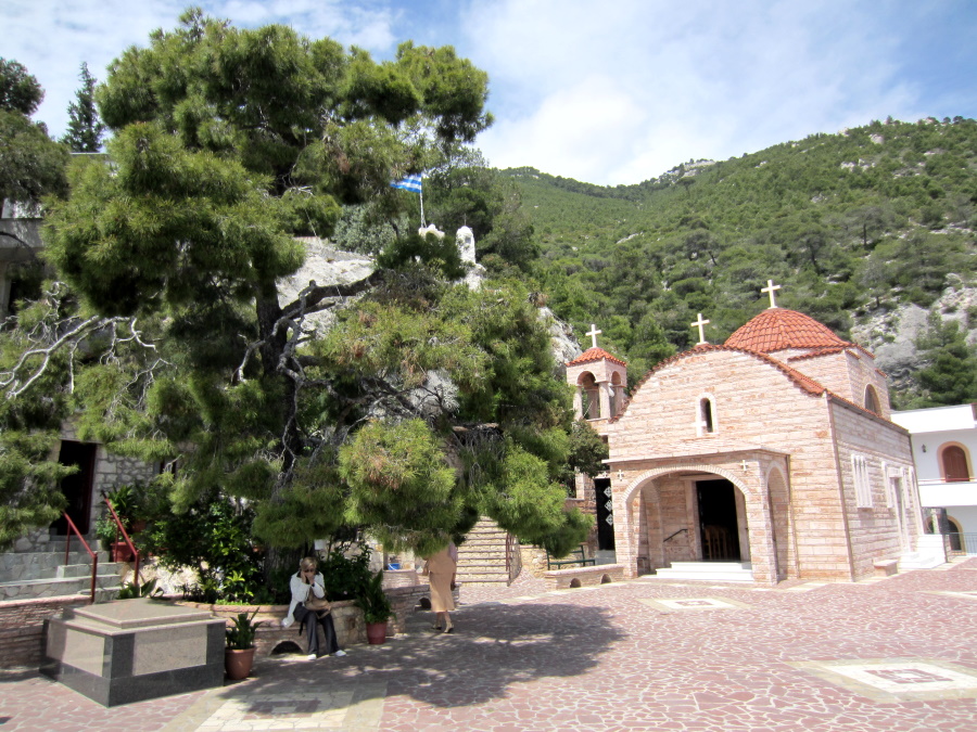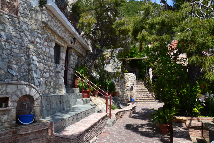 Монастырь находится над городом, и из него открывается потрясающая панорама на весь город и море. Но прежде чем порадуется взор, надо потрудиться. Вход в монастырь предваряется подъемом по 144 ступеням. Конечно, все немного устали, но наградой был не только прекрасный вид, но и радушный прием преподобного Патапия, в честь которого и назван монастырь.