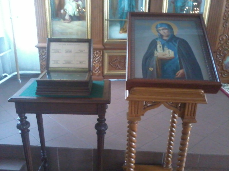 Слева у алтаря — большая икона св. Анны Кашинской с частицей мощей, а рядом мощевик с частицей мощей прп. Нила Столобенского. Из рассказа о монастыре мы узнали, что его первой настоятельницей, которая начала возрождение обители, была монахиня Фекла. (Вспомним поездку на Кипр. Согласитесь, что даже среди монахинь это имя не самое распространённое.)