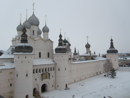 Перелистнув страницы жизни Печальника Земли Русской к самому началу, мы оказались в ростовских землях – на его первой родине. Здесь Преподобный появился на свет и провел свои детские годы. Необыкновенное чувство охватывает при посещении белокаменного Успенского собора Ростова Великого. Нынешний собор стоит на фундаментах соборов XII–XIII веков. Он поразил нас не столько своим величием, сколько тем, что именно здесь святой начал являть свои чудеса - находясь во чреве матери он трижды прокричал во время литургии - и именно здесь он принял Крещение. Мы помолились перед мощами святителя Леонтия Ростовского, к которым, наверняка, прикладывался и юный Варфоломей, приходивший сюда на службы вместе со своими родителями и двумя старшими братьями. Мы поклонились также гробнице архиепископа Феодора, племянника и ученика Преподобного, и митрополита Ионы Сысоевича, по повелению которого была построена знаменитая Успенская звонница. Самый большой из 15 колоколов – Сысой – весит 32 тонны. К сожалению, мы не могли остаться послушать благовест к воскресной всенощной, т.к. нас уже ждал Троице-Сергиев Варницкий мужской монастырь.
