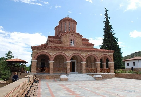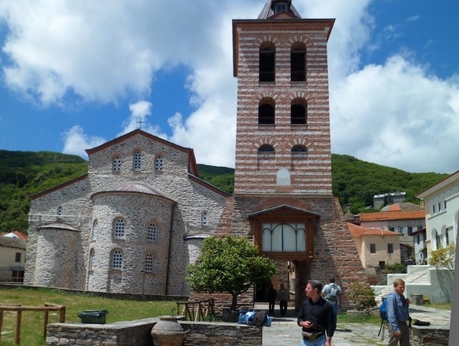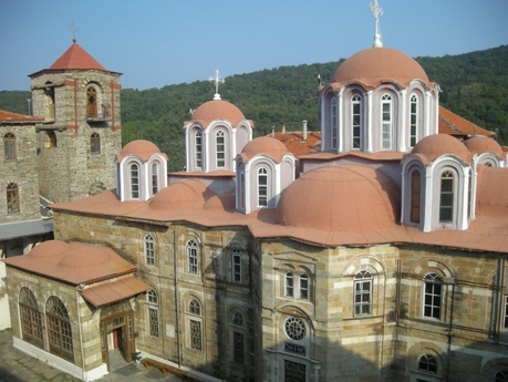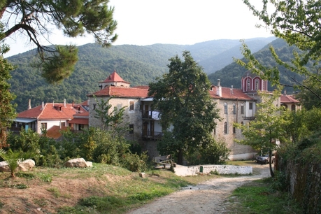 Вылетев из Москвы, через 3 часа 15 минут наша группа приземлилась в аэропорту Македония, где нас встретил водитель микроавтобуса. По дороге в Уранополис, договорившись с водителем, мы заехали в женский монастырь святого апостола и евангелиста Иоанна Богослова, основанный старцем Паисием, где по отшествии ко Господу он был похоронен 12 июля 1994 года.