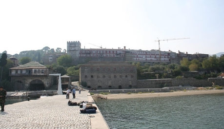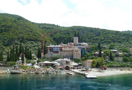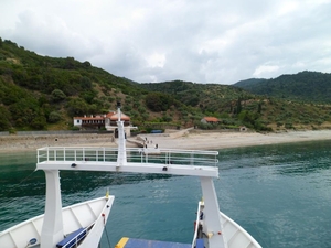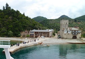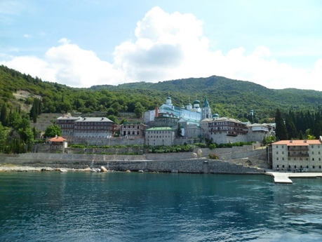 Катер идёт довольно близко к полуострову и все, что на берегу, видно отчетливо. Появляются монастырские причалы, первым — Хиландарский, потом Зографский. Если на берегу только одни причалы, это означает, что сами монастыри находятся выше в горах, до них нужно идти пешком или ехать. Далее следует Дохиар, это уже монастырская пристань, и на берегу виден сам монастырь.