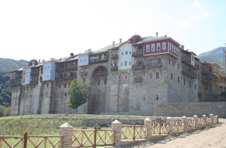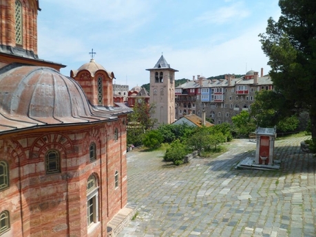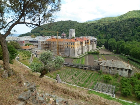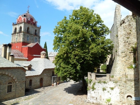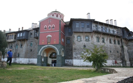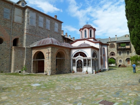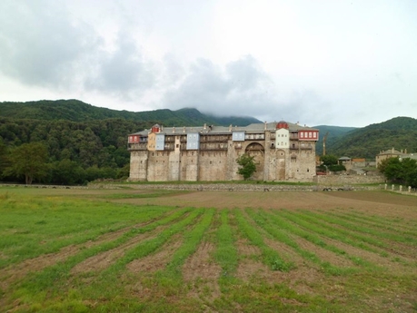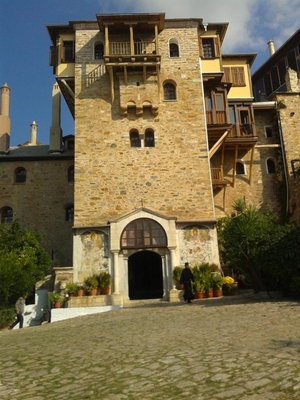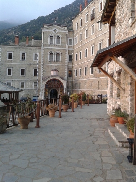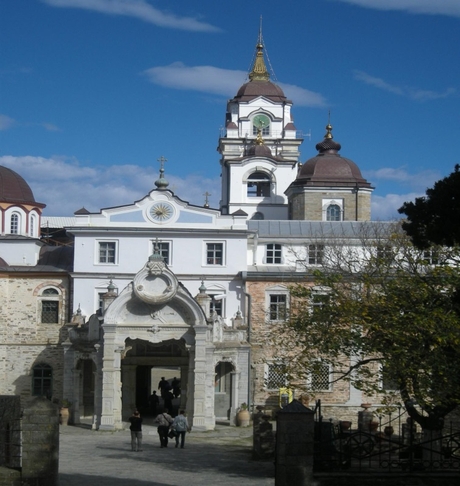 Из Кареи мы поехали на маршрутке в Иверон. Это крупный монастырь с большими зелеными огородами, с множеством хозяйственных построек, с огромной прибрежной территорией. Монастырь расположен не у самого берега, а метров на 200 отступает вглубь и находится в долине между горами. Пройдя через громадные ворота внутрь, попадаешь на просторное подворье, как и должно быть у крупного монастыря.