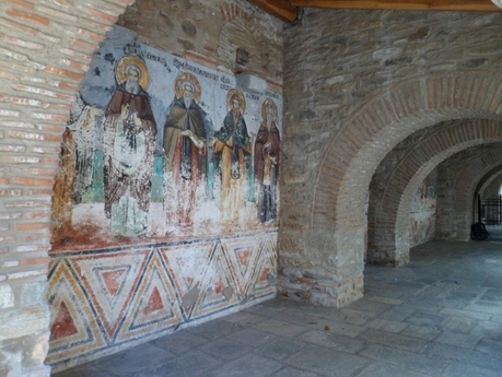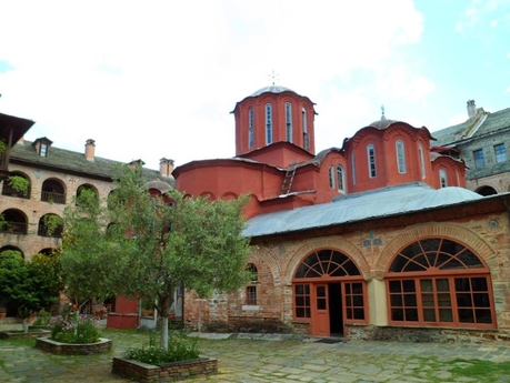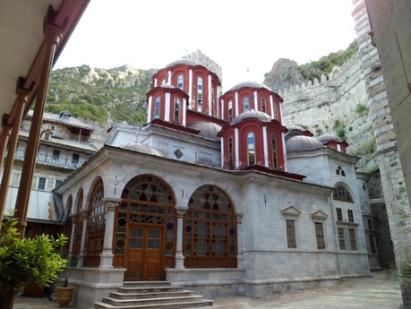 Архитектура здесь монументальная. При входе сразу находится красивейшая церковь из камня, похожего на красный мрамор, и это еще только один из параклисов. А главный храм Ватопеда вообще поражает воображение своим великолепием. Обращают на себя внимание украшения настенными фресками и мозаиками, потолки и ворота. Совершенно уникальный для Святой Горы памятник – настенные мозаики в кафоликоне Ватопеда – датируются эпохой Комнинов и представляют собой бесценное культурное наследие.