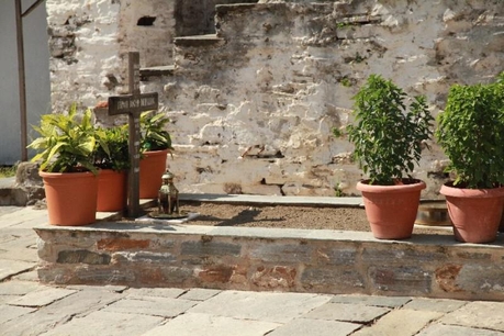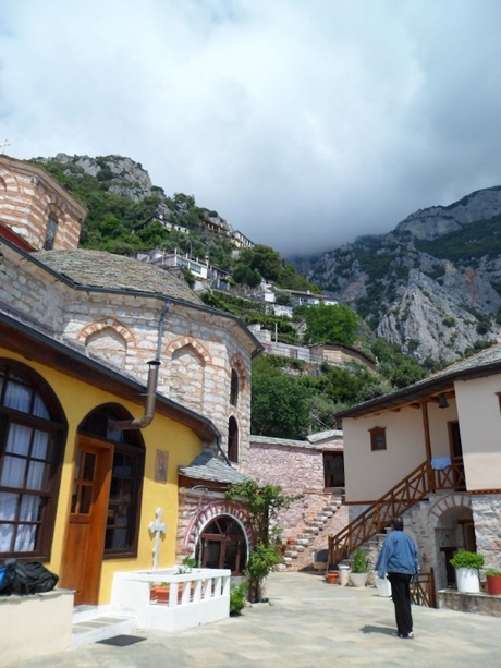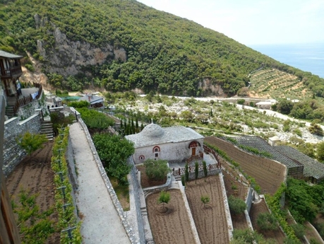 Подъём до Агиа Павла от причала по широкой каменистой дороге занимает минут 30-40. Монастырь помещается на небольшом плато, на скале, причем задняя стена встроена прямо в скалу. Единственная мраморная церковь внутри – очень красивая. Это и есть главный (соборный) храм монастыря, а на Афоне он называется кафоликоном. Кроме кафоликонов, бывают дополнительные храмы поменьше, они называются параклисами, в этом небольшом монастыре их нет. Очень интересно устроены маленькие огородики и сады, на разных ярусах на горе под монастырём, как бы на ступеньках.