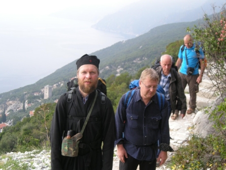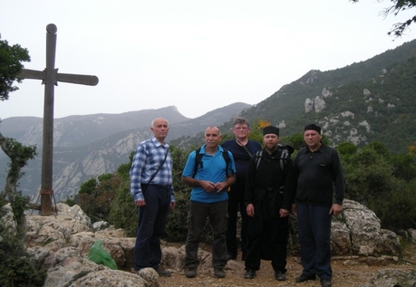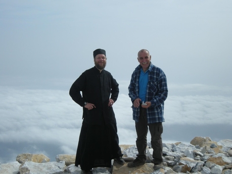Следующая часть пути до Панагии была более трудной, нам предстояло подняться на высоту 1 500 м над уровнем моря, на это у нас ушло три часа. Но погода нам благоприятствовала. Солнце не палило, а сопутствующий ветер давал прохладу. В этом чувствовалось забота о нас Божией Матери. Особенно это понимали те, кому уже приходилось совершать восхождение. Так через 4 часа после выхода мы были на Панагии. Здесь мы сделали короткую остановку на 45 минут, во время которой передохнули и слегка подкрепились. Хотя силы восстановили только частично, мы приступили к последнему отрезку подъема на гору Афон. Затратив 1 час 40 минут, мы завершили наше восхождение на высоту 2 033 м над уровнем моря. Удивительно было то, что на вершине было так тепло, что теплые вещи нам совершенно не пригодились, даже ветра, который нам сопутствовал всю дорогу, не было. А ведь обычно здесь бывает очень холодно и дует пронизывающий ветер. Просто чудо!