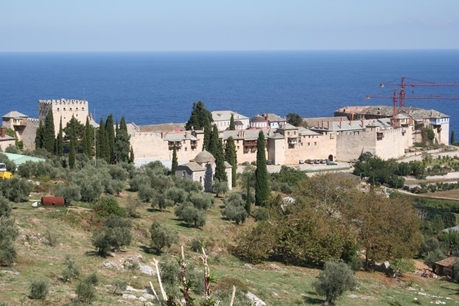Здесь мы в непосредственной близости от горы Афон. А у подножья, на высоте метров двести, на склоне горы находится сам монастырь. Величественное зрелище!