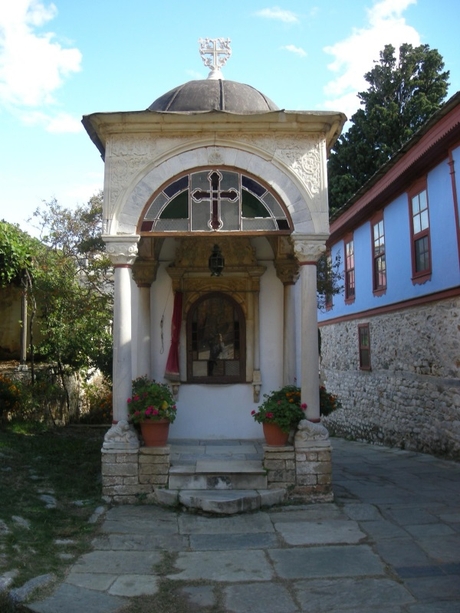 Помолившись у Иверского образа Божьей Матери и купив иконки в магазине монастыря, мы сели в ждавший нас микроавтобус и поехали в монастырь Филофей, в котором в этот день мы остановились.