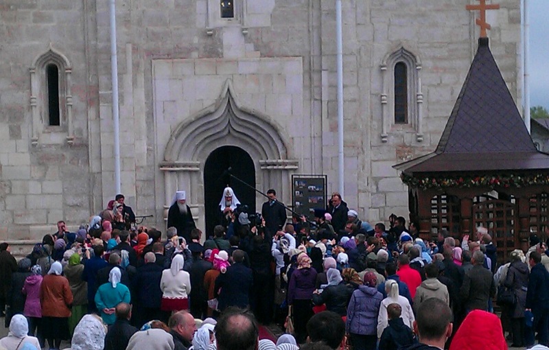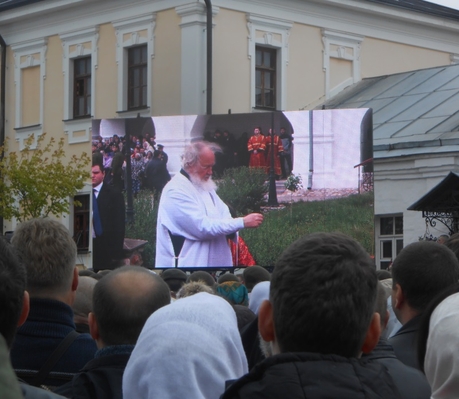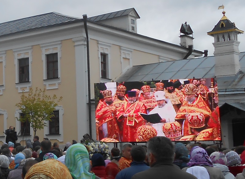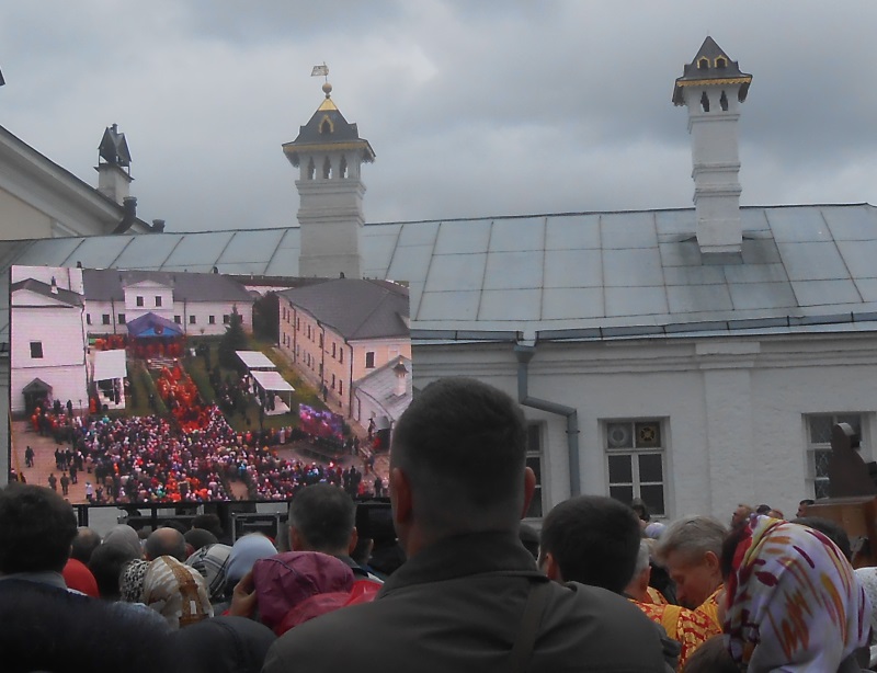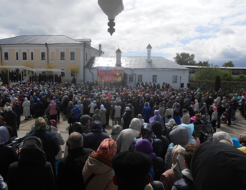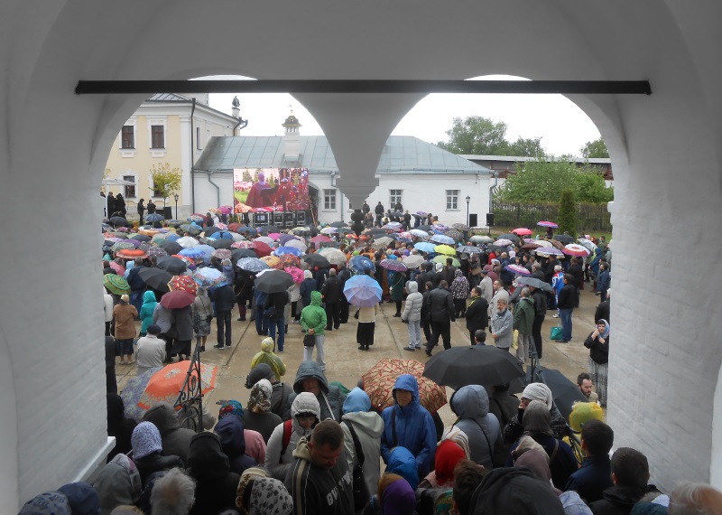 Несмотря на непогоду, литургия под открытым небом, которую совершал в Высоцком монастыре Святейший, собрала множество верующих, желавших помолиться Царице Небесной вместе со своим Патриархом. Престол был установлен под сенью, устроенной между Никольским храмом и настоятельским корпусом с церковью в честь иконы Божией Матери «Скоропослушница». Пели два замечательных мужских хора — монастырский и епархиальный. А перед входом в обитель и на монастырской площади были установлены большие экраны, на которых транслировалось все, происходящее на службе.