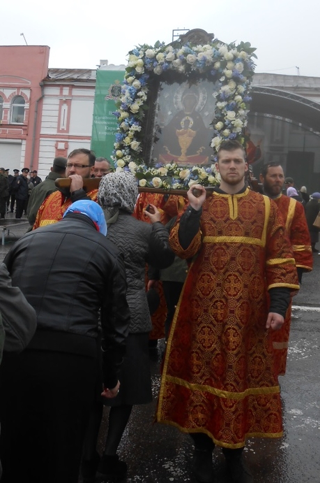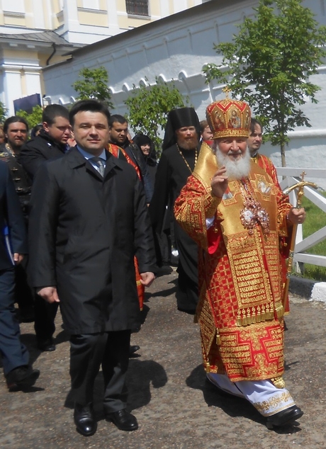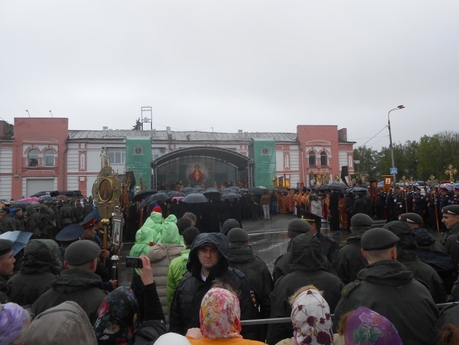 Крестный ход с чудотворным образом «Неупиваемая Чаша», возглавляемый Святейшим Патриархом Кириллом и губернатором Московской области А.Ю. Воробьевым, начался при ясной погоде. Но только мы отошли от монастырских стен и повернули на дорогу, ведущую к нашей цели — к центральной городской площади, пошел проливной дождь, и снова пришлось открывать зонты. Но колонны молящихся не поредели, скорость движения не понизилась, пение пасхального канона не прекратилось. Только немного беспокоила одна мысль — как там, впереди, наш Святейший?..