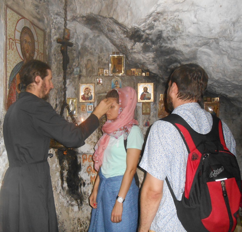 Затем был тот участок нашего маршрута, на котором мы почувствовали себя настоящими паломниками. По узкой и довольно крутой тропинке мы не без труда поднялись к пещерке, в которой подвизался апостол Христов, по пути поклонившись отмеченному крестом месту его мученической кончины. В гроте душа словно открывается для молитвы и благодати… Пропето величание, на челе появился крест, нанесенный отцом Варсонофием маслом из горящей перед иконой апостола лампады, а уходить не хочется…