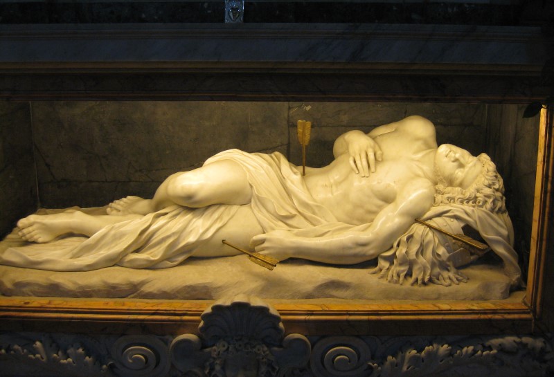 …Святого убили палками на ипподроме. С радостными восклицаниями отошел он ко Господу, для того чтобы принять венец победы. Тело мученика было сброшено в мусорный ров. В сонном видении Севастиан явился христианке Лукине и повелел погребсти его в катакомбах. В XI в. мощи мученика были перенесены в расположенную рядом базилику, построенную в 320 году святым императором Константином.