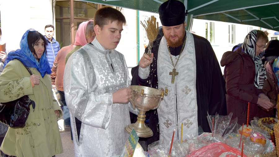 После богослужения по благословению настоятеля храма пророка Божия Илии протоиерея Максима Шевцова гостям были вручены куличи, с которыми они отправились в пешеходную зону у храма для освящения.