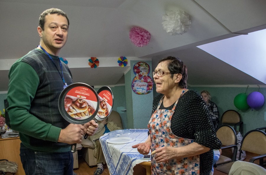 А потом настало время отпробовать в деле новые сковородки-блинницы и специальную тарелку для складывания блинов, купленные на средства, выделенные настоятелем нашего храма. Так что девушки-прихожанки напекли румяных блинов и оладушек — в придачу к многочисленным масленичным произведениям обыденских хозяюшек, присланных в центр вместе со сладостями, сгущенкой, сметаной.
