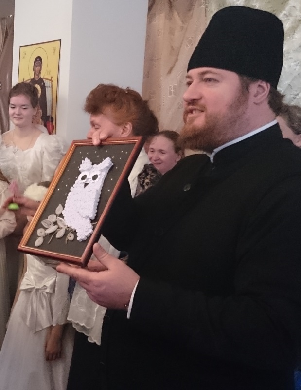 После представления гости и артисты разделили общую трапезу, во время которой не только пообщались, но и вместе попели любимые песни, а также обменялись сувенирами. Специальный подарок, сделанный ребятами из дома-интерната, был вручен настоятелю Обыденского храма протоиерею Максиму Шевцову, по благословению которого и проходят эти встречи, ставшие уже доброй традицией.