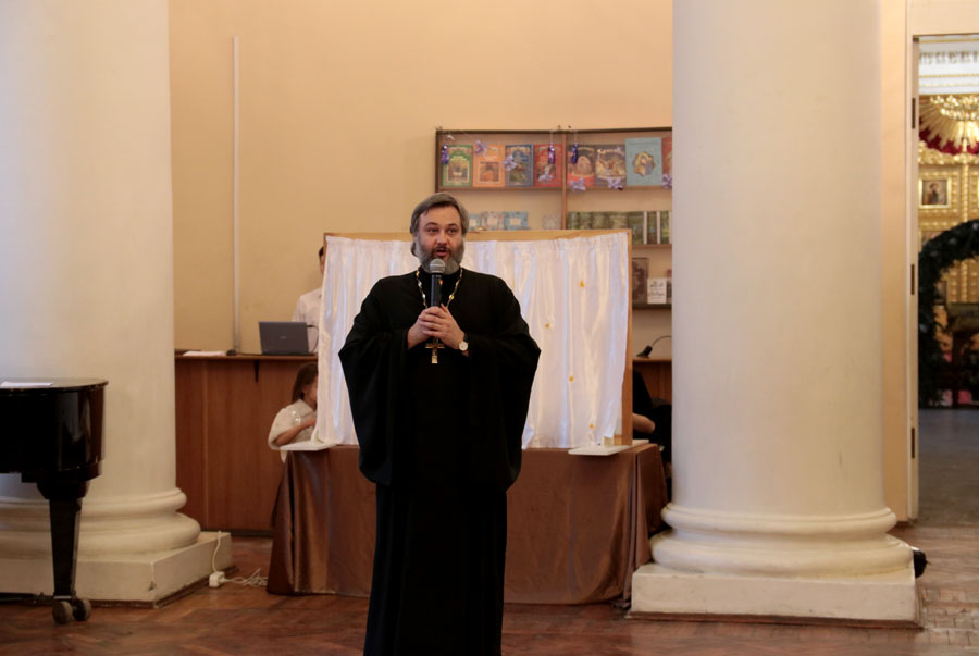 После пения тропаря праздника Рождества Христова с приветственным словом к собравшимся обратился ответственный по Центральному благочинию Комиссии по церковному просвещению и деятельности воскресных школ при Епархиальном Совете г. Москвы протоиерей Михаил Гуляев.