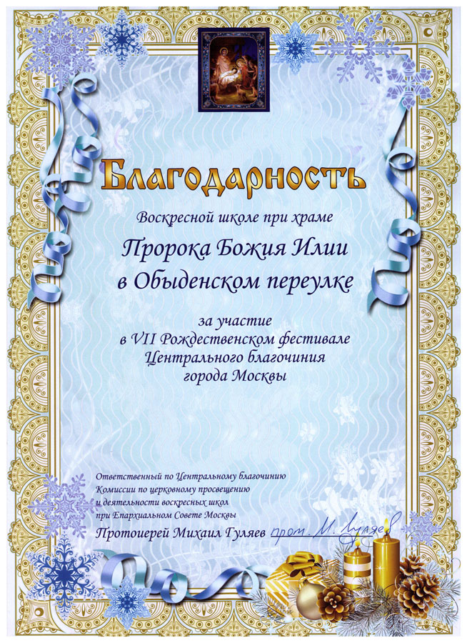 Ученики младшей группы Илие-Обыденской воскресной школы педагога-руководителя С. А. Судаковой исполнили на фестивале рождественские колядки, подготовленные с преподавателем Т. Н. Семеновой. Успехи выступавших были отмечены грамотой руководства воскресных школ Центрального благочиния.