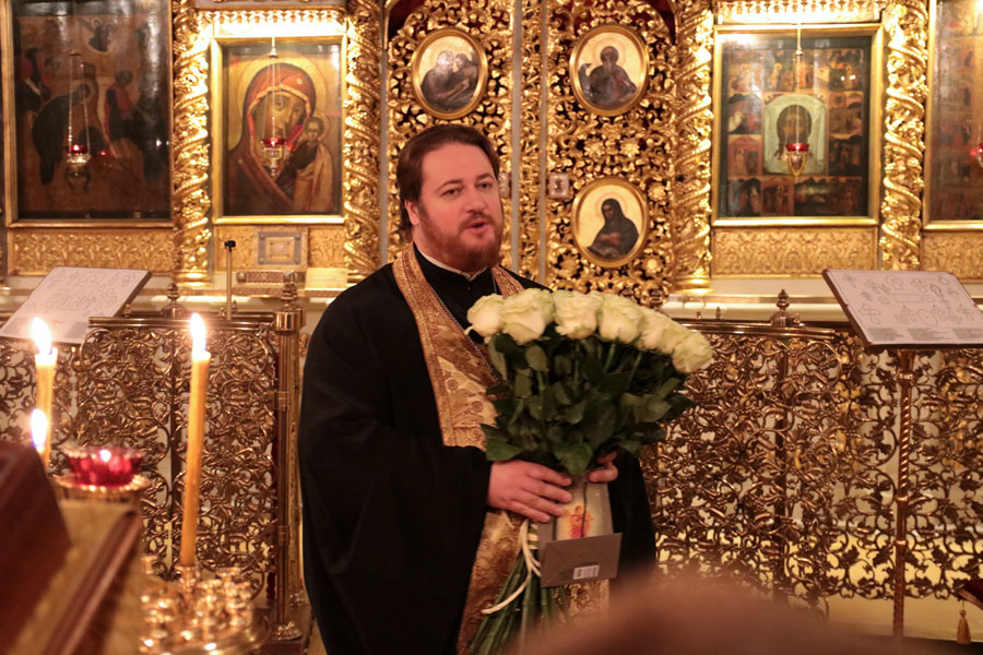 Дети, их родители, взрослые учащиеся и педагоги преподнесли отцу Максиму букеты белых роз и других цветов.