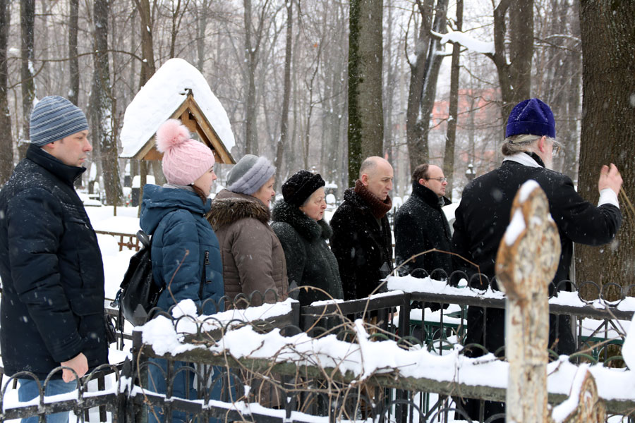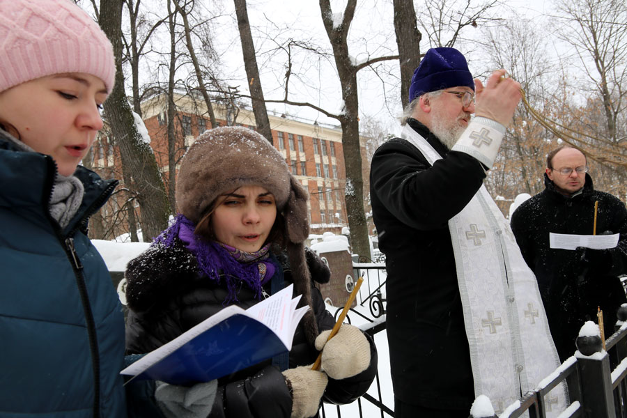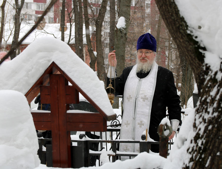 По традиции на Немецком (Введенском) кладбище собрались духовные дети почившего пастыря, прихожане Илие-Обыденского храма и благочестивые москвичи. Морозный день и глубокий снег не смогли воспрепятствовать соборной заупокойной молитве. Отец Николай отслужил на могиле батюшки Александра панихиду с общим пением собравшихся.