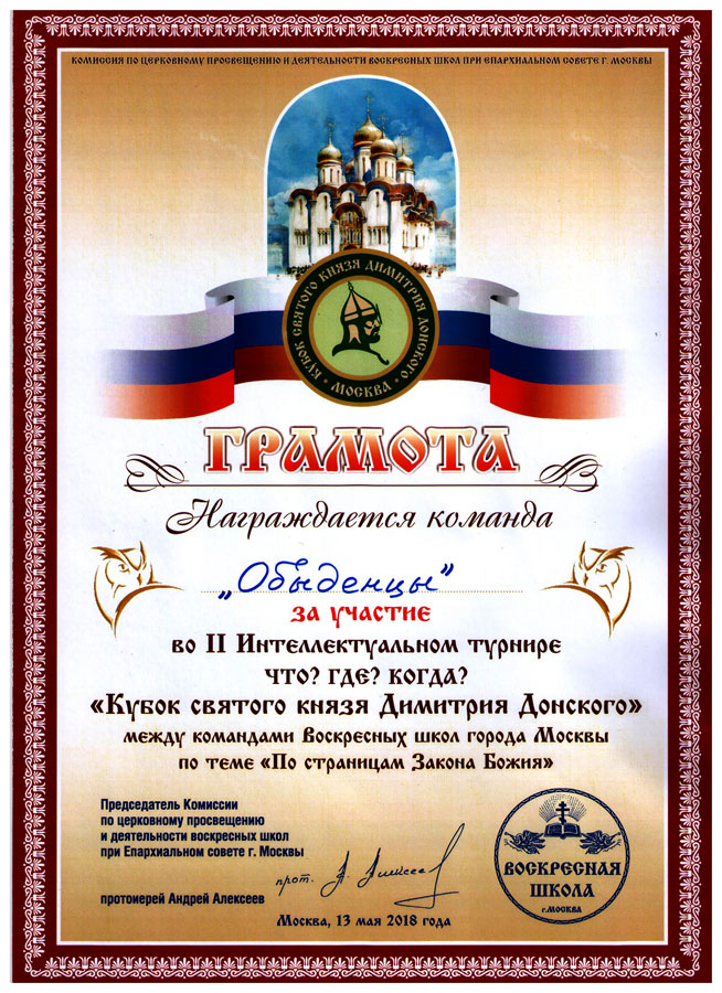 Состоялось состязание 11 команд из различных викариатств столицы. По благословению священноначалия «Обыденцы» представляли на турнире команду Центрального викариатства. В команду вошли учащиеся группы преподавателя Т. В. Качалы, для которых были организованы специальные занятия по подготовке к турниру.