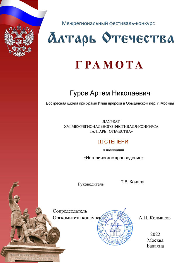 Учащийся нашей воскресной школы Артем Гуров стал лауреатом III степени в номинации «Историческое краеведение». Его работа была посвящена деятельности священномученика Серафима (Чичагова) в Московском регионе. Руководитель проекта — Татьяна Вадимовна Качала.
