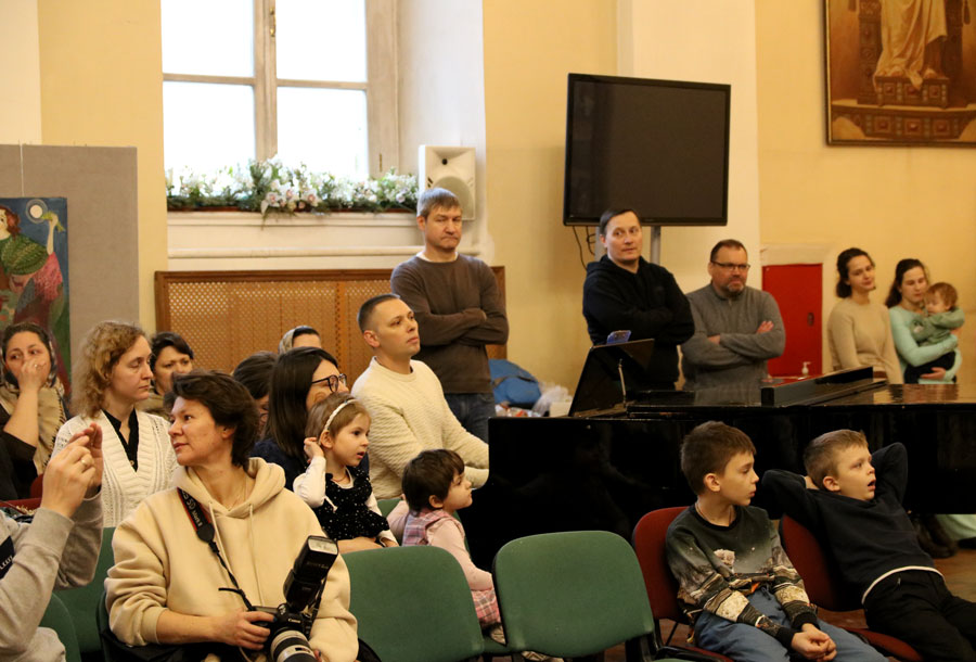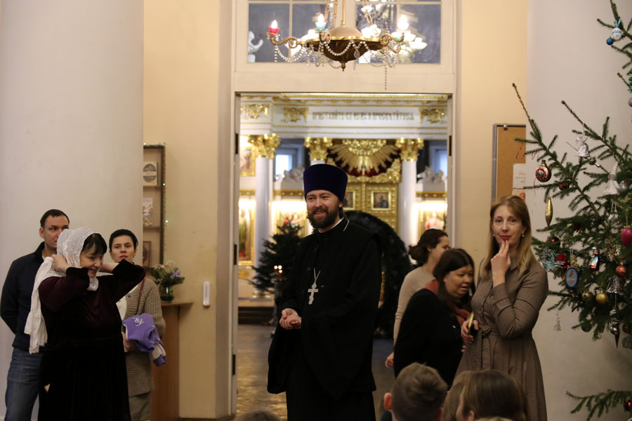 После общего пения тропаря праздника Рождества Христова с приветственным словом к собравшимся обратился ответственный по Центральному благочинию Комиссии по церковному просвещению и деятельности воскресных школ при Епархиальном Совете г. Москвы иерей Сергий Уваров.