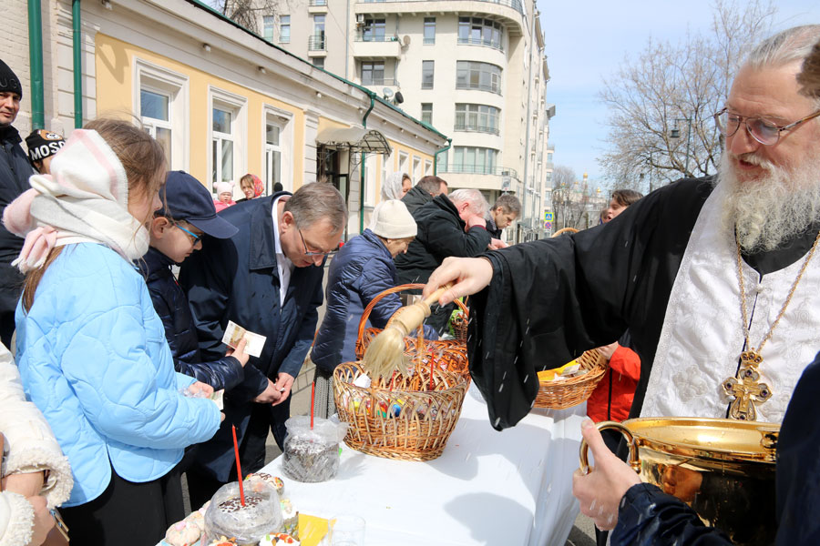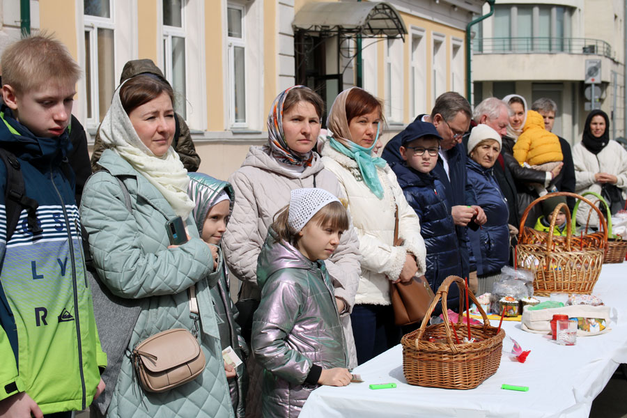 После Божественной литургии Великой Субботы дети с родителями освятили пасхальные снеди на улице перед храмом и собрались в зале воскресной школы.