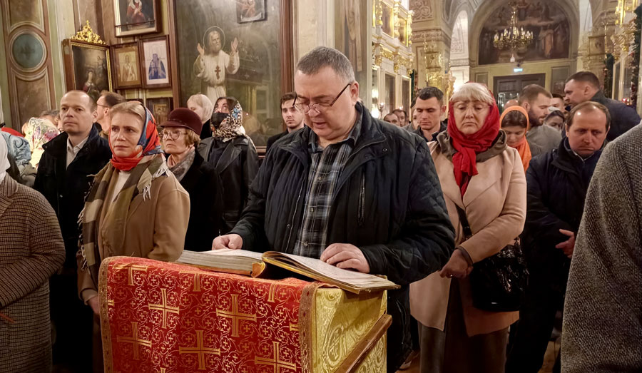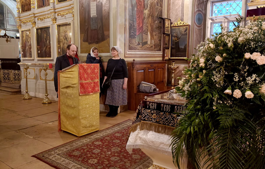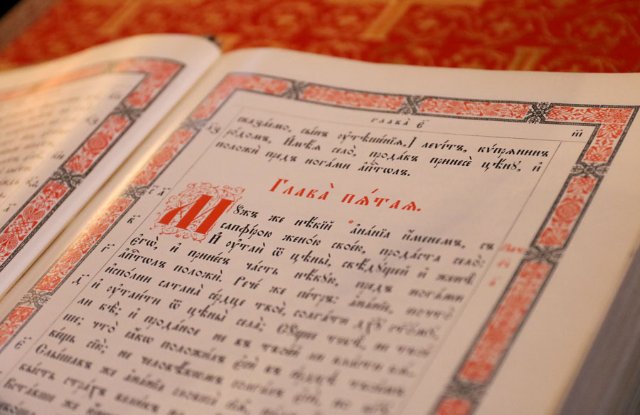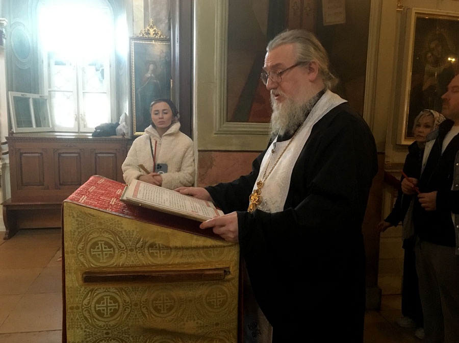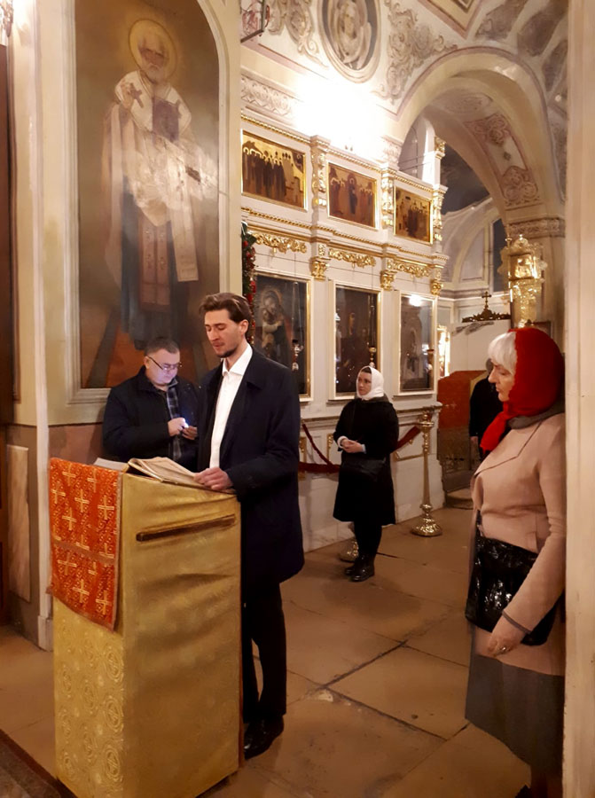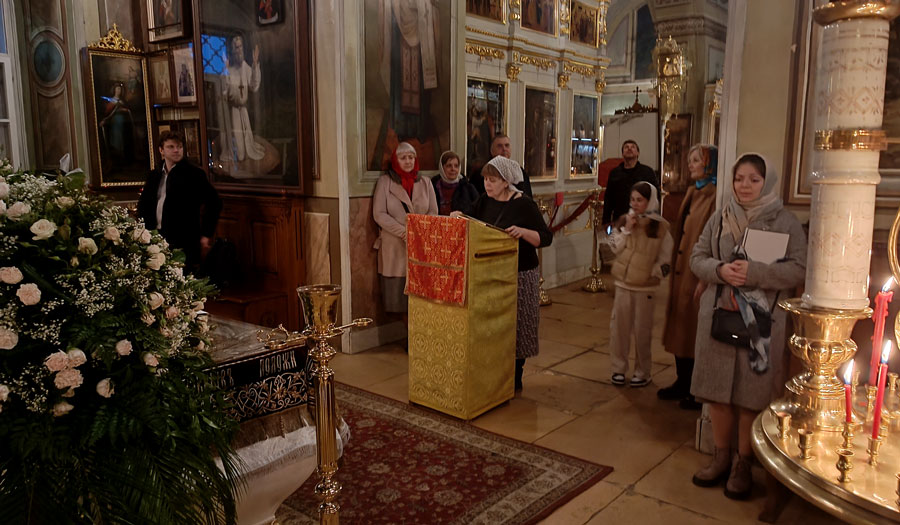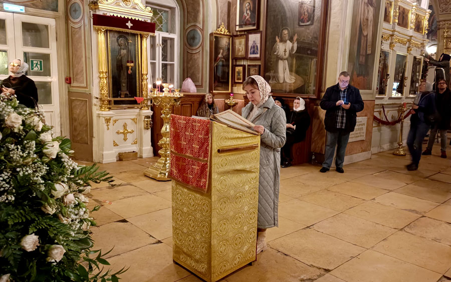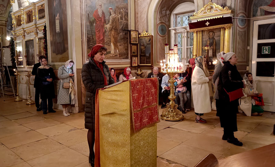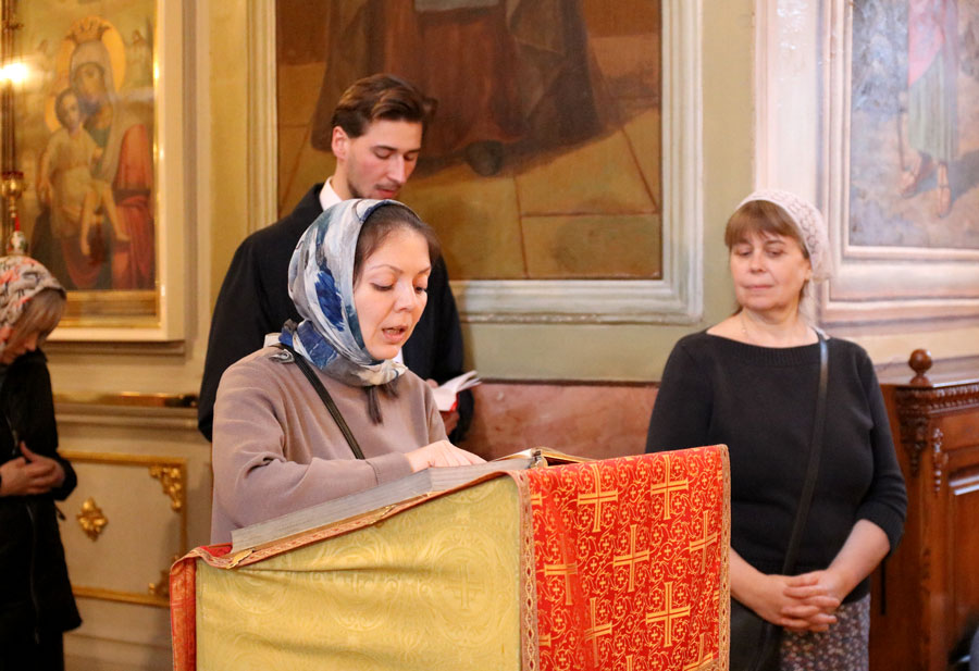 Преподаватели и выпускники групп практической литургики воскресной школы читали в храме Деяния святых апостолов на церковнославянском языке.