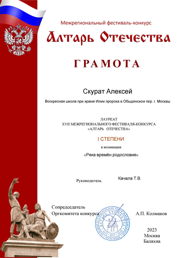 Учащийся нашей воскресной школы Алексей Скурат с педагогом Татьяной Вадимовной Качалой приняли участие в конкурсе в номинации «Река времён: родословие». Ими была проведена большая исследовательская работа по изучению одного их дворянских родов Костромской губернии. Алексей стал победителем в этой номинации и получил диплом I степени.