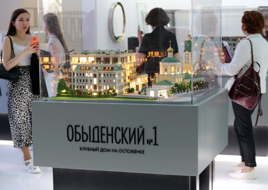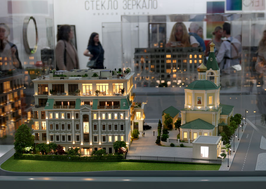 Искусно сделанную модель шестиэтажного клубного дома с площадкой для отдыха наверху (3-й Обыденский пер., 1; в рекламе – «Обыденский № 1») украшала модель соседствующего Илие-Обыденского храма.