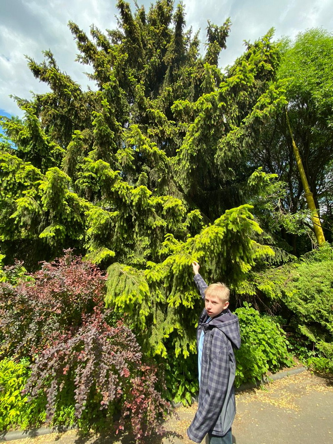 Затем мы переместились в дендрарий. Это огромная выставка древесных и кустарниковых растений. Там мы познакомились с несколькими видами клёнов, тополей, каштанов, с родственником самого высокого дерева в мире — секвойи и с хищной лианой.