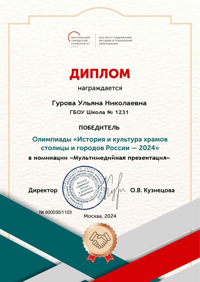 Учащаяся нашей воскресной школы Гурова Ульяна представила на конкурс мультимедийную презентацию. Она выполнила исследовательскую работу под руководством педагога Т. В. Качалы и научного консультанта протоиерея Николая Скурата и стала победителем олимпиады.Всего в 2023/2024 году в олимпиаде приняло участие 3800 обучающихся из 411 образовательных организаций города Москвы, на конкурс в номинации «Мультимедийная презентация» было представлено 2343 работ.