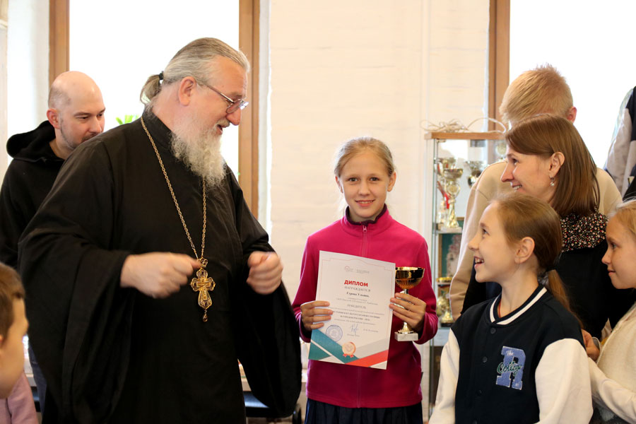 К сожалению, Ульяна не смогла присутствовать на официальном вручении наград. Диплом и кубок передали в храм, и их Ульяне вручил духовник воскресной школы протоиерей Николай Скурат.