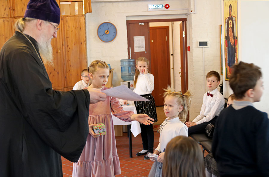Детский фестиваль начался общим пением тропаря праздника Рождества Христова. С приветственным словом к детям и родителям обратился духовник воскресной школы протоиерей Николай Скурат. Батюшка вручил дипломы и подарки учащимся воскресной школы — участникам конкурса детского творчества «Красота Божьего мира» и выставки рисунков «Белый Ангел».