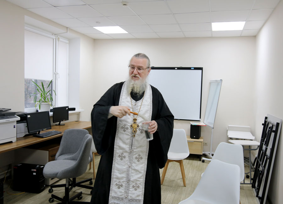 Батюшка ответил на вопросы подопечных и сотрудников ЦМД, а также по согласованию с администрацией по традиции окропил помещения центра агиасмой.
