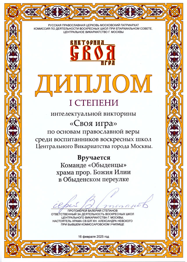 Учащиеся нашей воскресной школы ежегодно принимают участие в интеллектуальных турнирах по основам православной веры «Своя игра» с 2019 года. Ребята начали участвовать в них в возрасте 8–9 лет, поэтому для многих из нашей команды этот турнир был уже пятым или шестым в их жизни. Наша команда достаточно легко одержала победу, но этому предшествовали многолетние упорные занятия по «Закону Божию».