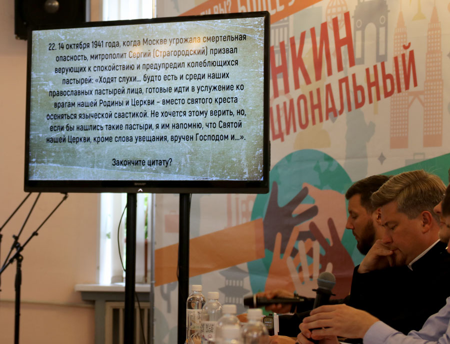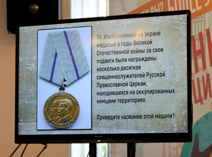 Вопросы игры касались жизни и деятельности Русской Православной Церкви и ее отдельных представителей в годы Великой Отечественной войны. Команды должны были знать: имя, фамилию и должность протоиерея, который к началу Великой Отечественной войны занимал один из ключевых постов церковного управления Московской Патриархией; какое событие произошло в годы Великой Отечественной войны в деревне Горелки Тульской области; название кафедрального Ленинградского собора в 1941–1999 гг.; какое обвинение было вменено осужденным митрополиту Феофану (Тулякову), архиепископу Серафиму (Остроумову) и епископу Иннокентию (Никифорову); о восстановление евхаристического общения с какой Поместной Православной Церковью велись переговоры в 1943 г.; имя церковного иерарха, который написал стихотворение, посвященной И.В. Сталину; какой образ носил с собой маршал Б.М. Шапошников и многое другое.