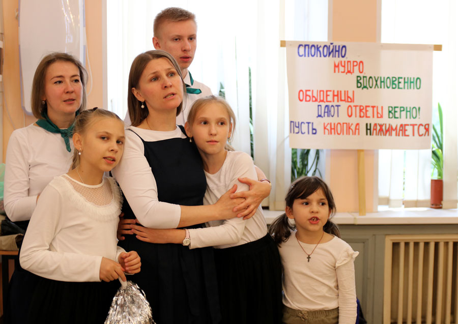 По условиям игры отвечать имела возможность та команда, которая первая нажимала на кнопку после звукового сигнала. К сожалению, наши участники значительную часть игры не смогли справиться в этой задачей, зато потом наверстали опущенное и своими верными ответами получили второе место. Особо отличился ученик старшей детской группы нашей воскресной школы Никодим Черемухин, которому была вручена медаль как «самому умному» игроку.
