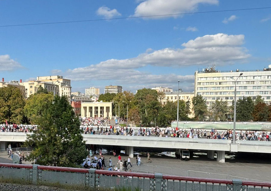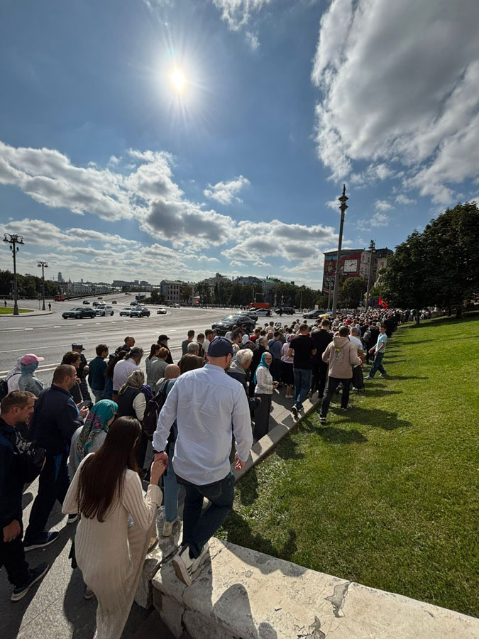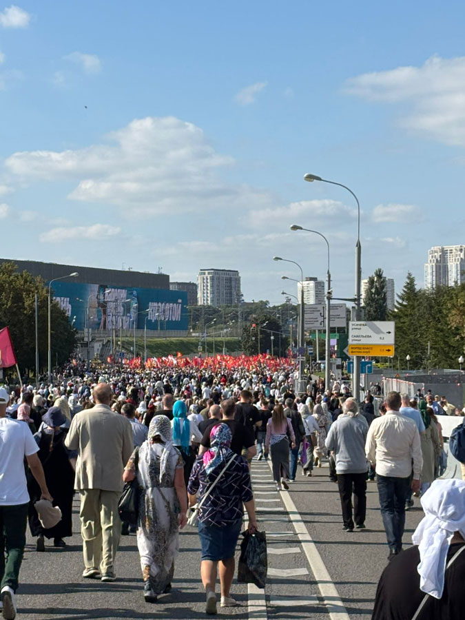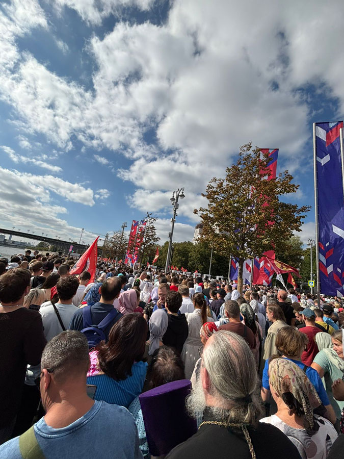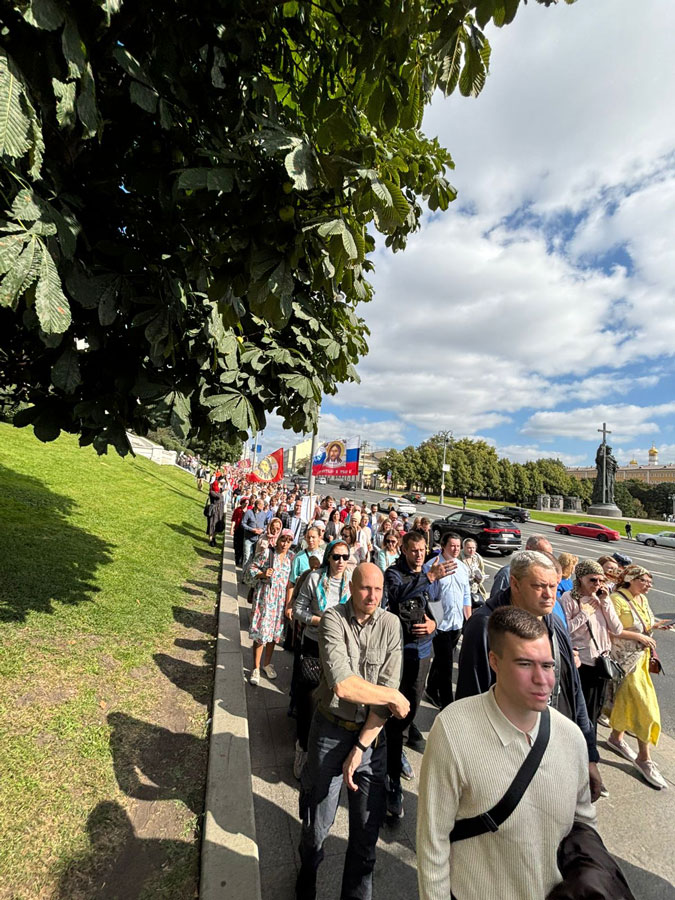 Задолго до начала крестного хода огромная очередь участников выстроилась от станции «Библиотека им. Ленина» до ул. Ленивки, где был официальный вход на крестный ход для тех, кто не смог попасть на богослужение в Храме Христа Спасения. От Ленивки до Соймоновского проезда собравшиеся православные христиане ожидали Святейшего Владыку и начало крестного хода.
