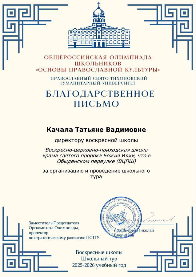 Олимпиада была организована и проведена директором воскресной школы Т. В. Качалой.