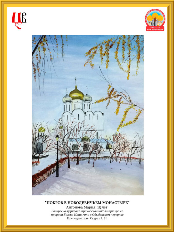 В епархиальном этапе конкурса участвовала 301 работа из 68 учебных заведений г. Москвы. Во второй возрастной группе (13–17 лет) рисунок «Покров в Новодевичьем монастыре» Марии Антоновой занял третье место и был направлен на конкурс в Синодальный Отдел религиозного образования и катехизации.