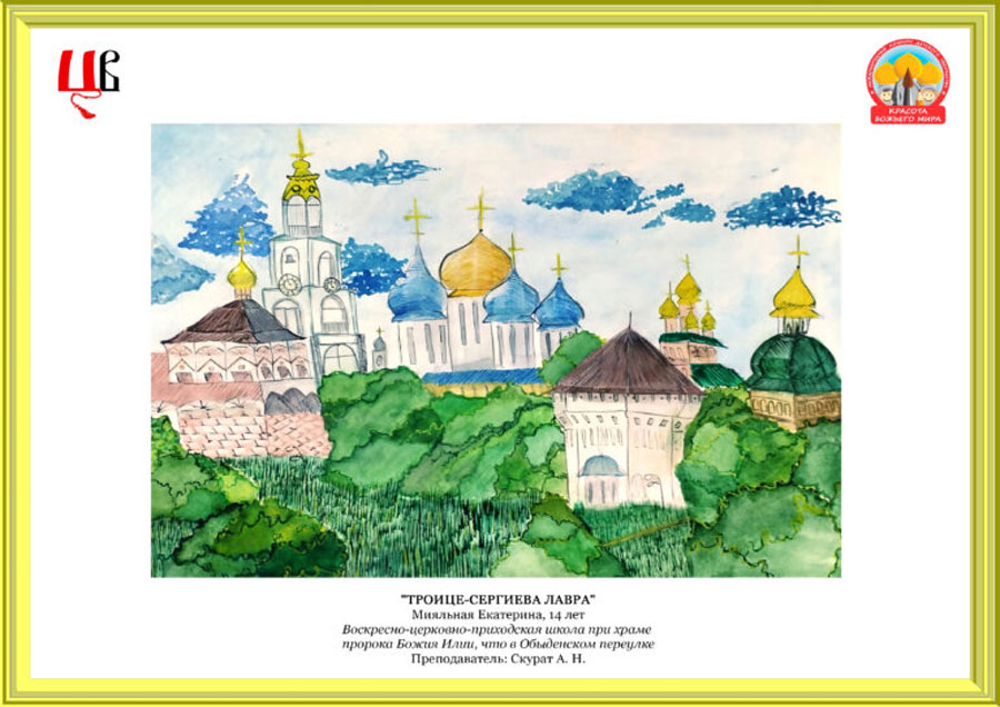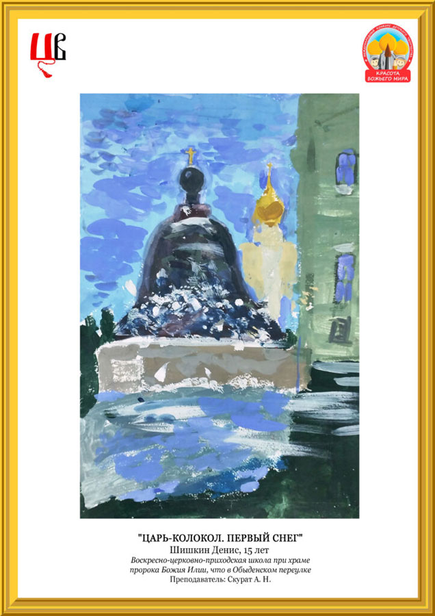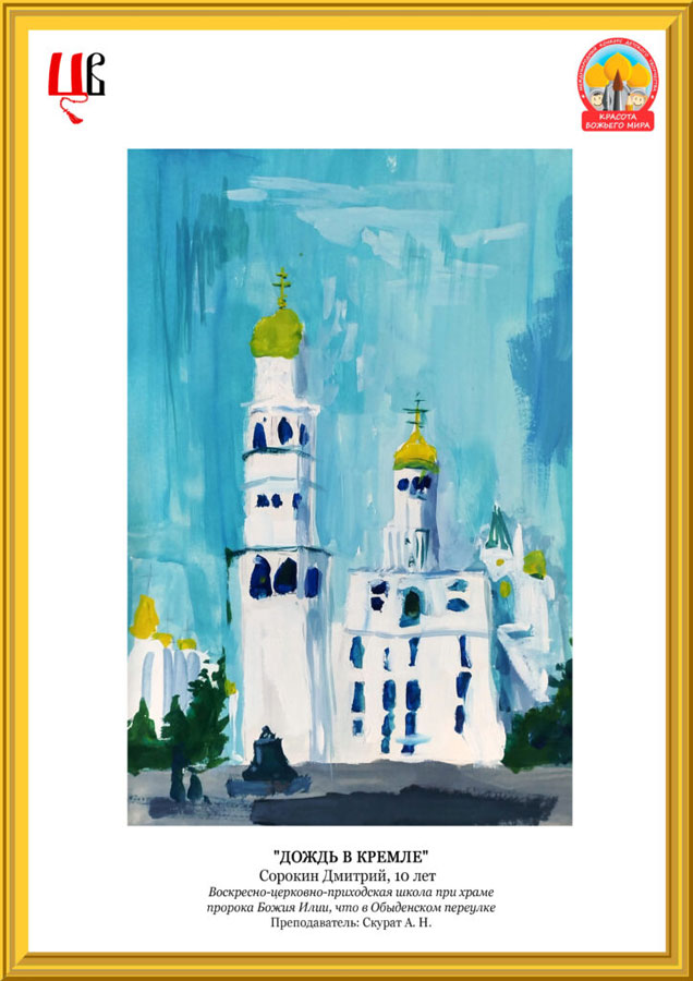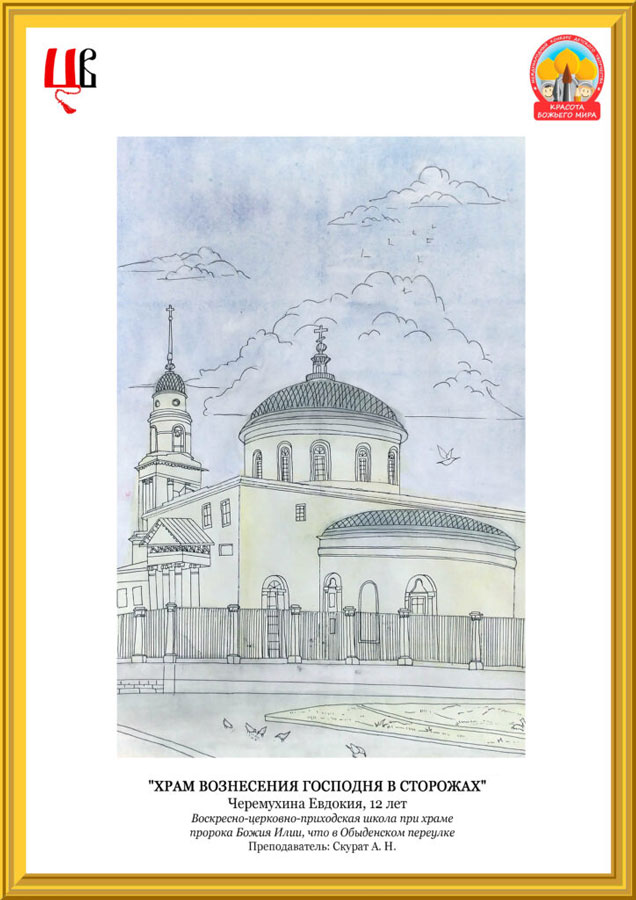 Наша воскресная школа передала в Центральное викариатство 13 рисунков. Шесть художественных работ наших учащихся вошли в число лучших работ викариатского этапа конкурса и были направлены на городской этап в Отдел религиозного образования города Москвы. Победителями викариатского этапа стали работы «Музей-заповедник Кижи» Ивана Лазарева, «Дождь в Кремле» Дмитрия Сорокина, «Храм Вознесения Господня в Сторожах» Евдокии Черемухиной, «Покров в Новодевичьем монастыре» Марии Антоновой, «Троице-Сергиева Лавра» Екатерины Мияльной и «Царь-колокол. Первый снег» Дениса Шишкина.