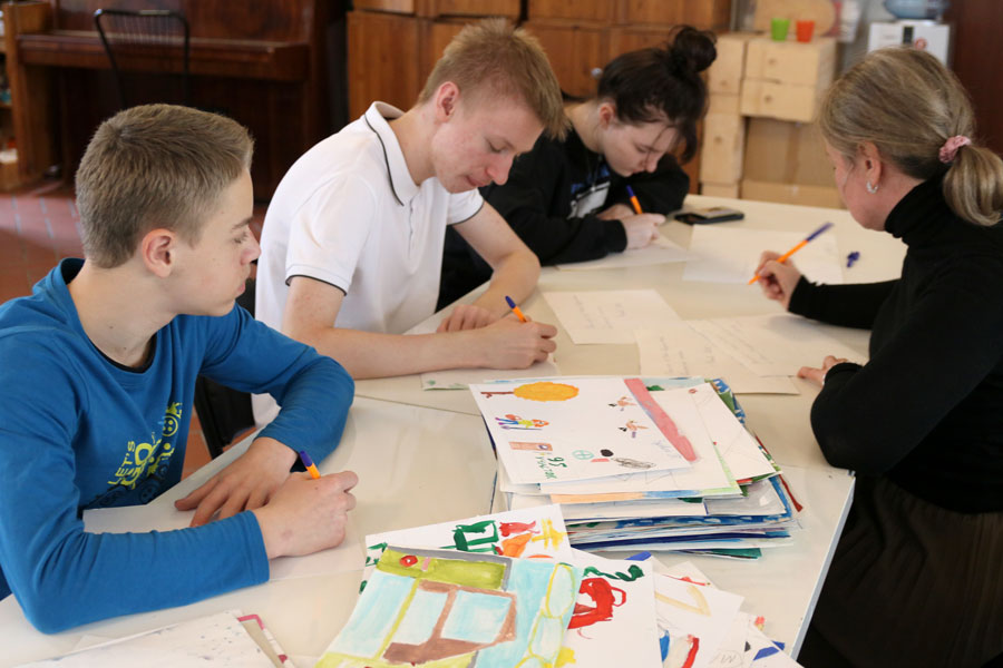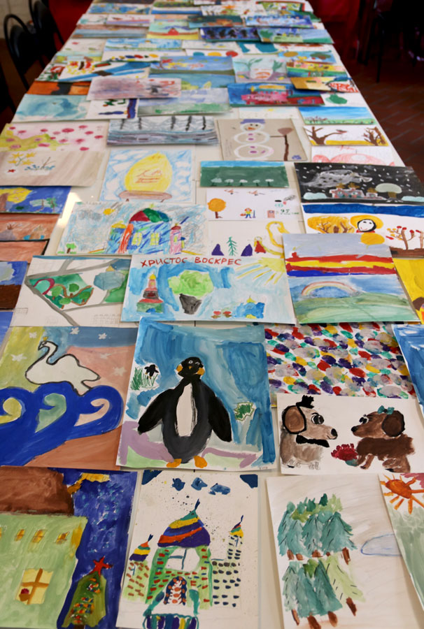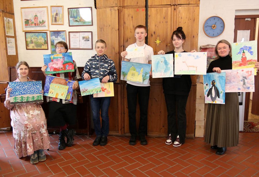 Дети вместе с педагогами А. Н. Скурат и В. Н. Скурат подготовили к отправке и подписали свои рисунки по военной и мирной тематике, выполненные на занятиях воскресной школы.