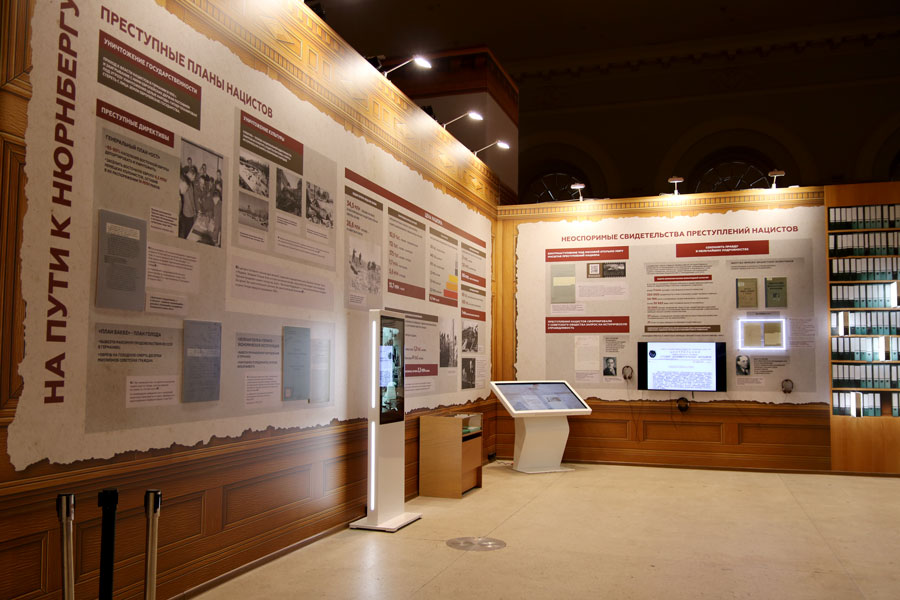 В экспозиции представлено более 700 экспонатов. Это уникальные архивные документы и музейные артефакты периода Великой Отечественной войны из 50-ти федеральных и ведомственных архивов и музеев России и Беларуси, из частных коллекций. Отдельный зал рассказывает о Нюрнбергском трибунале — о суде, в котором преступлениям нацистов было дано имя и мера.