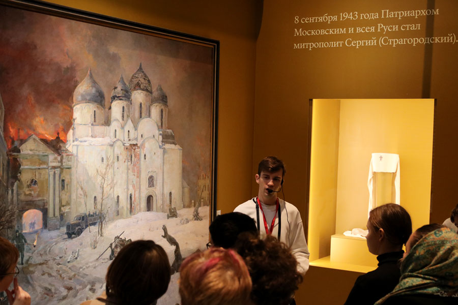 Отдельный зал посвящен поддержке защиты Отечества со стороны мирян и духовенства Русской Православной Церкви, непосредственному участию православных верующих в боевых действиях на фронтах, в партизанских отрядах и в доблестном труде на пользу обороны страны.