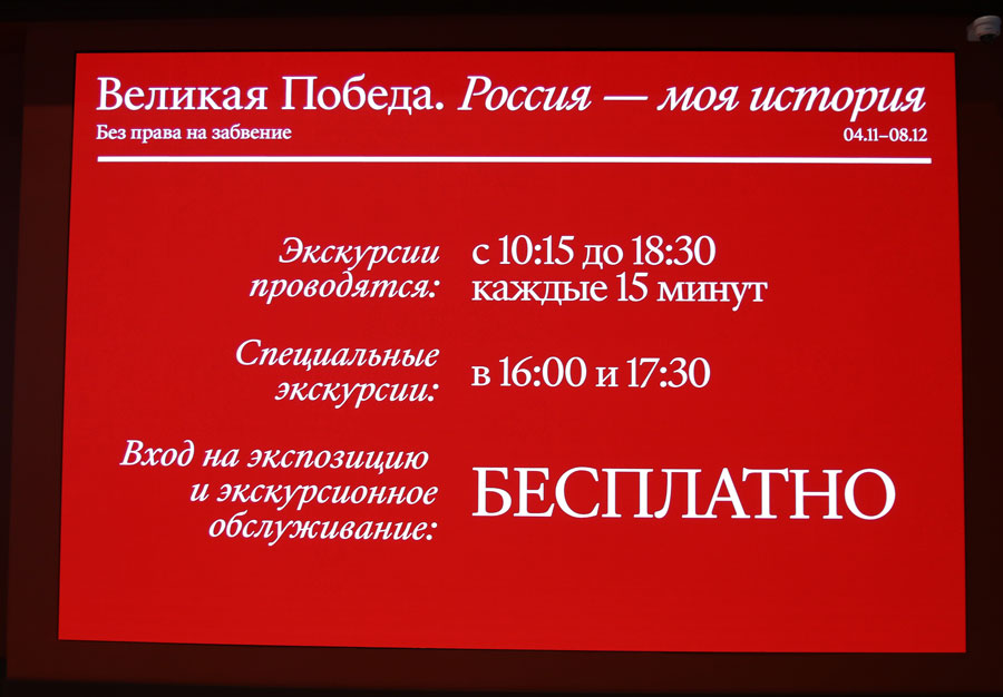 Историко-документальная выставка «ВЕЛИКАЯ ПОБЕДА. Россия — Моя история» проходит с 5 ноября по 8 декабря 2025 года. Экспозиция охватывает период от вторжения войск нацистской Германии и ее сателлитов в пределы СССР 22 июня 1941 года до подписания Акта о капитуляции Японии 2 сентября 1945 года, который официально завершил Вторую мировую войну.