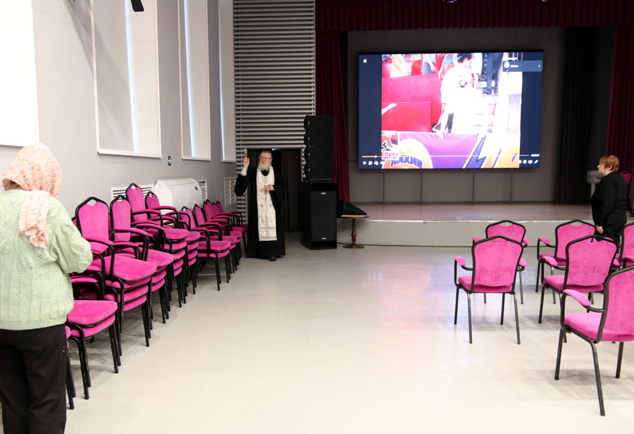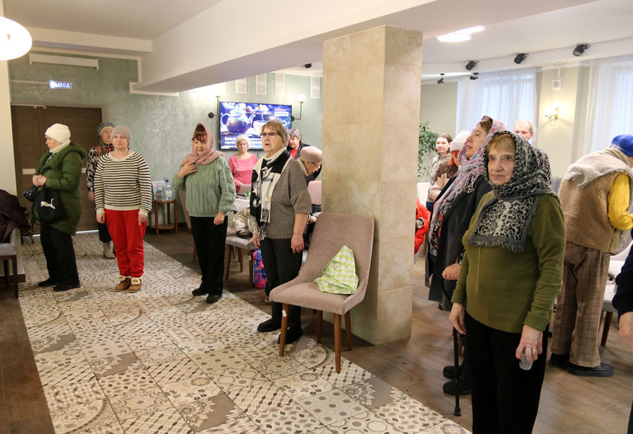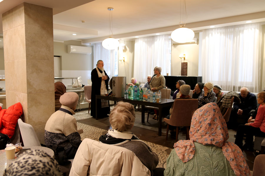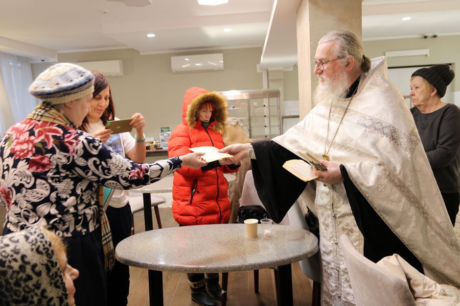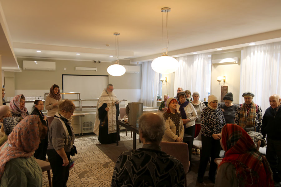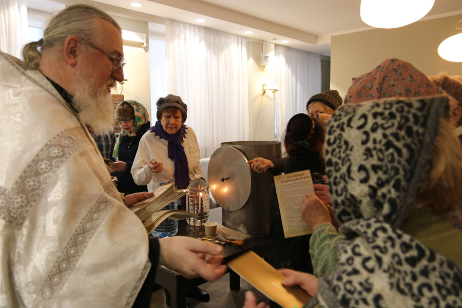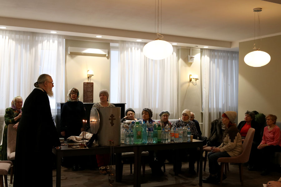 Перед началом общей молитвы протоиерей Николай, окормляющий этот центр, провел краткую беседу-напоминание о празднике Крещения Господня и о значении водоосвящения. Затем для немощных пожилых людей (самому старшему из которых исполнилось 96 лет) и инвалидов было совершено великое освящение воды. В богослужении приняли участие певчие из волонтерского приходского хора воскресной школы для взрослых.