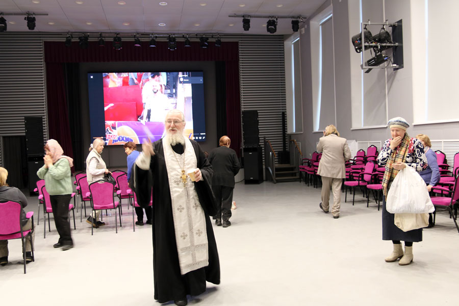 Батюшка ответил на вопросы подопечных и сотрудников ЦМД, а также по согласованию с администрацией по традиции окропил помещения центра агиасмой. Пожилые люди получили в подарок церковные календари и катехизические брошюры. Также отец Николай вручил подарки сотрудникам центра, которые стараются скрасить старость немощных людей и повысить активность более молодых пенсионеров и инвалидов.
