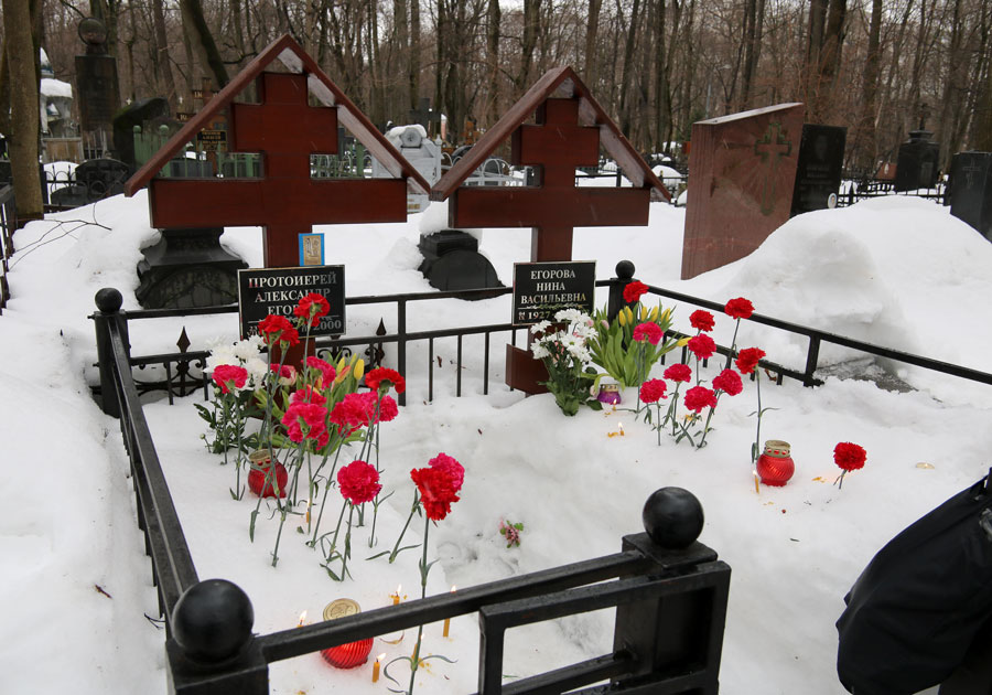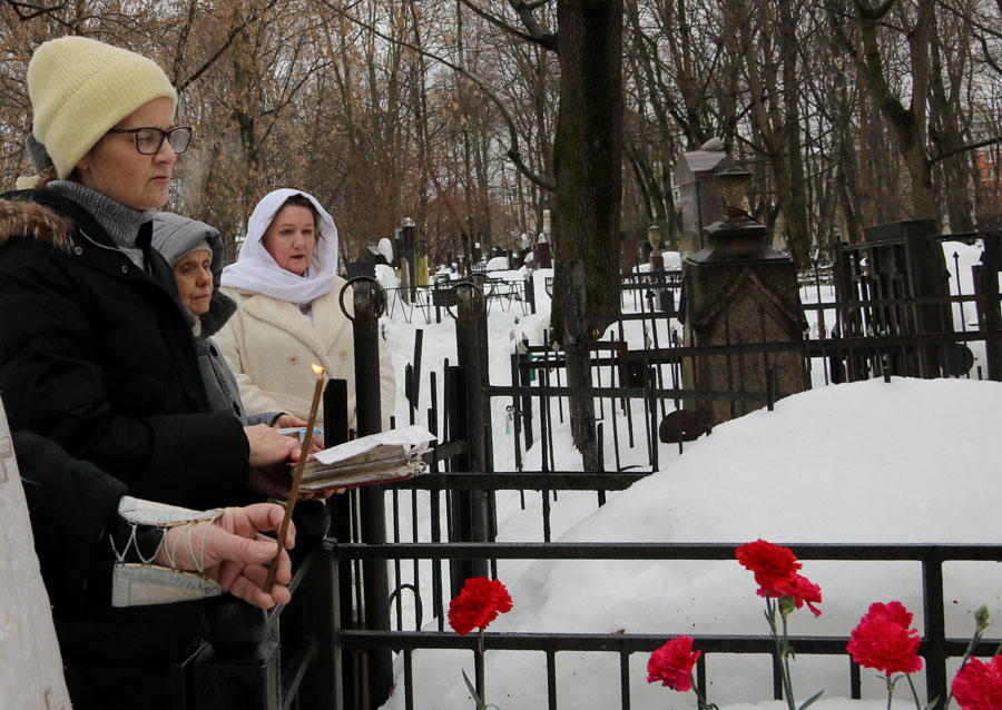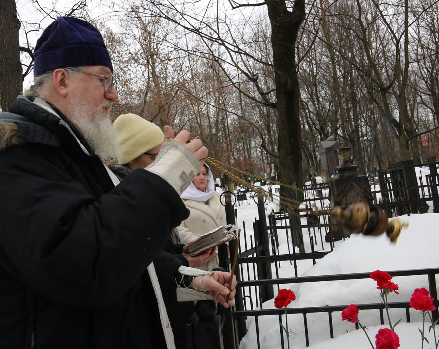 После молитвы на месте упокоения батюшки собравшиеся не смогли традиционно посетить многие могилы почивших клириков и прихожан нашего храма и пропели им «вечную память» у могилы отца Александра — из-за сильной заснеженности к большинству чтимых могил доступа не было. Даже на открытых участках кладбища последние снегопады уходящей зимы намели сугробы по пояс. К месту погребения нашего батюшки по глубокому снегу была прокопана тропа.