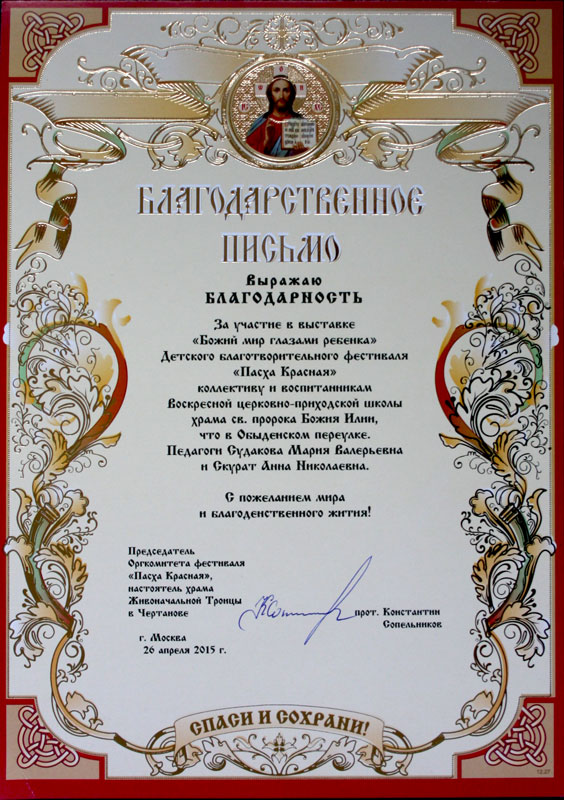 Деятельность воскресной церковно-приходской школы Илие-Обыденского храма была отмечена благодарственным письмом оргкомитета Пасхального фестиваля.